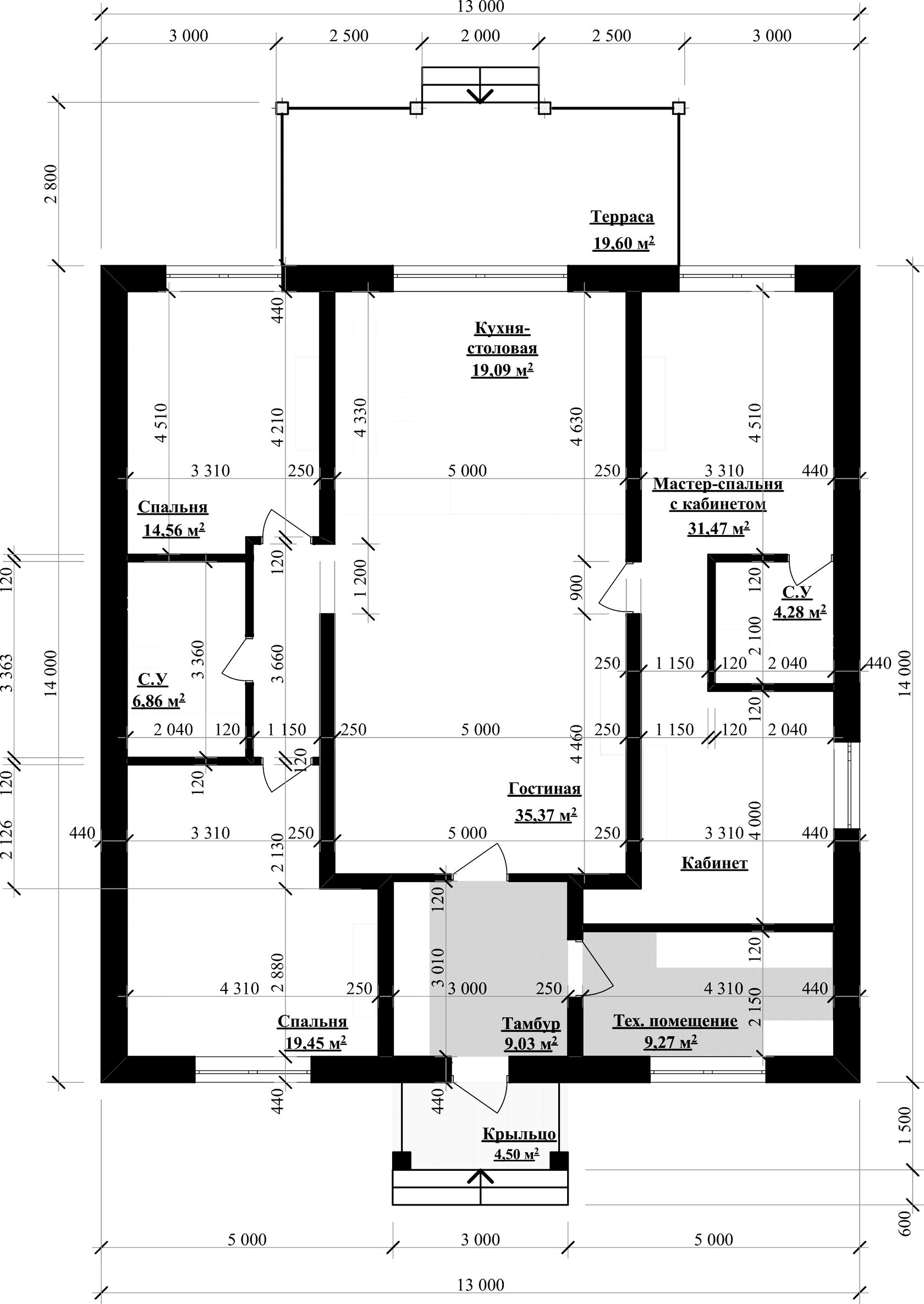 Стены Кирпич Поротерм 440 мм ЖБ армопояс утепленный (Пеноплэкс) и оконных перемычек Кладка на теплый раствор с армировкой каждый ряд А3 d6mm Внутренние перегородки несущие — кирпич Поротерм 250 мм Внутренние перегородки — кирпич Поротерм 120 мм